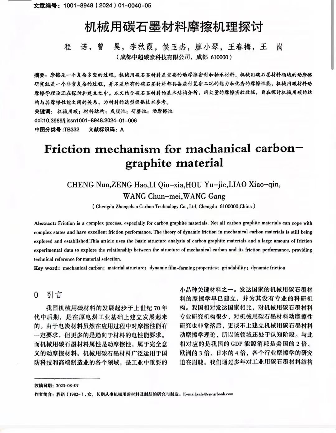 《機(jī)械用碳石墨材料摩擦機(jī)理探討》論文發(fā)表! 標(biāo)志著成都中超碳素年輕的科研技術(shù)團(tuán)隊(duì),在碳石墨材料研究方面將不負(fù)重任努力前行!